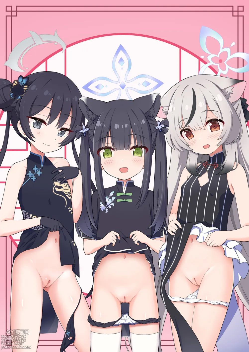 chinese dress,group,hair buns,halo,harem,kemonomimi,animal ears,lolicon,twintails,very long hair